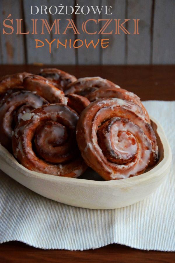 Wyrośnięte ciasto krótko wyrobić. Podsypując delikatnie mąką rozwałkować na prostokąt o wymiarach ok. 30 x 40 cm. Powierzchnię posmarować roztopionym masłem, posypać mieszanką cukru z przyprawami i zwinąć wzdłuż dłuższego boku. Pokroić na 15 równych części - ślimaków, które ułożyć na dwóch blaszkach (wyłożonych papierem do pieczenia) w sporych odległościach od siebie**.